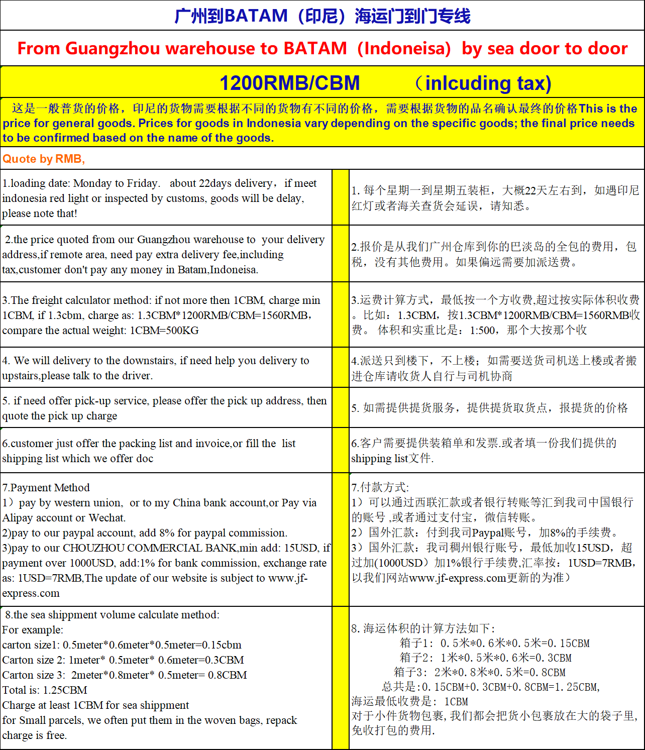 以下是我们从广州到巴淡岛门到门海运的价格