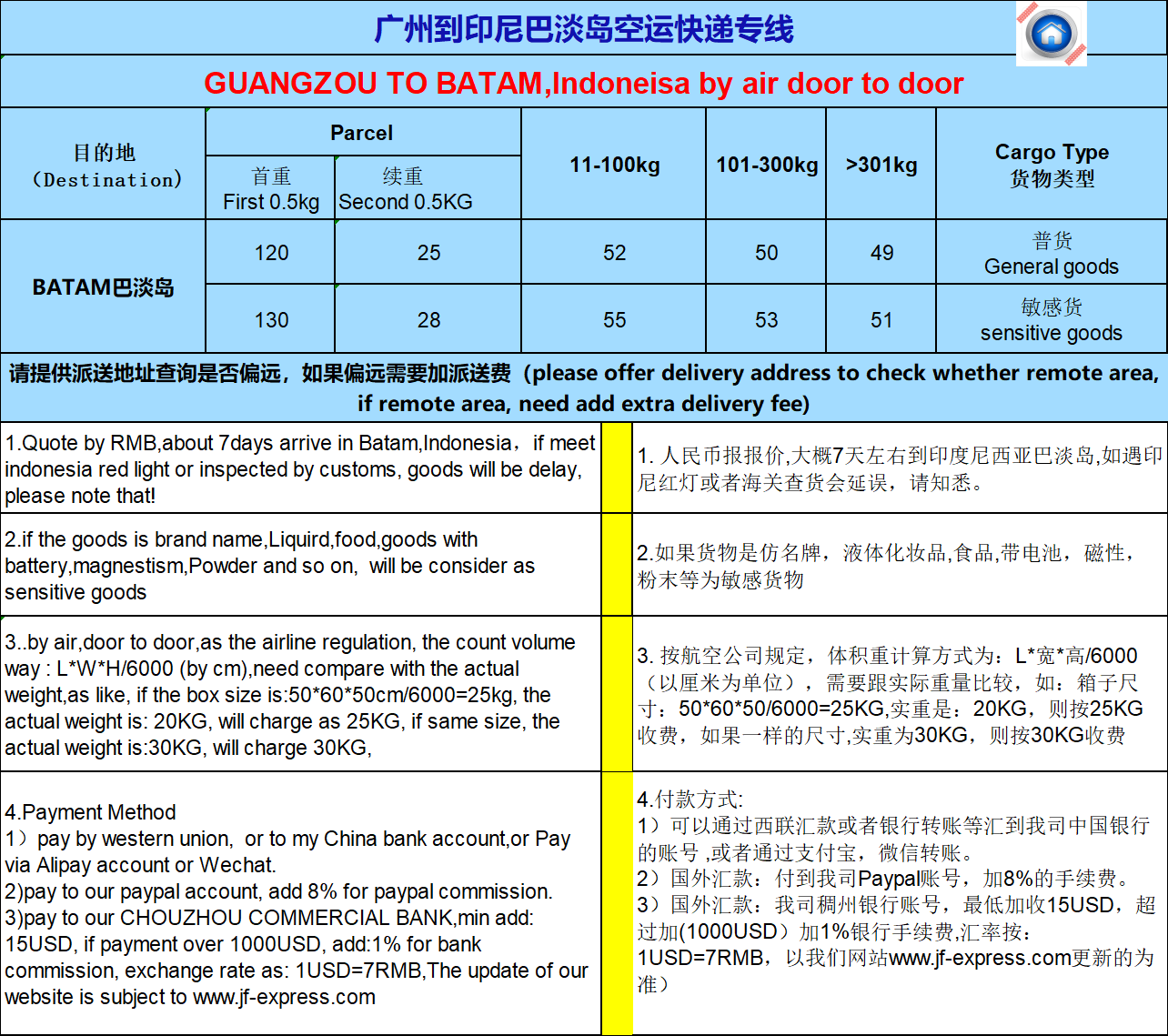 以下是我们从广州到巴淡岛门到门空运的价格